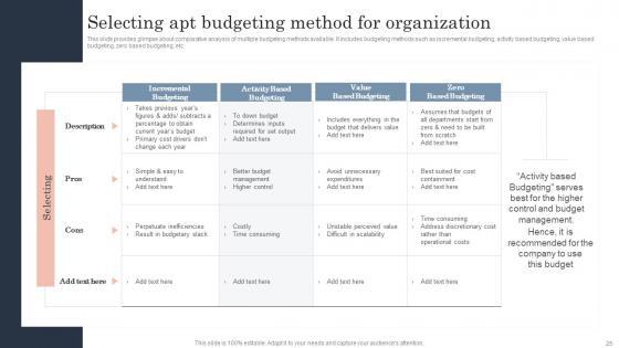 This slide provides glimpse about comparative analysis of multiple budgeting methods available. It includes budgeting methods such as incremental budgeting, activity based budgeting, value based budgeting, zero based budgeting, etc.Boost your pitch with our creative Selecting Apt Budgeting Method For Organization Guide To Corporate Financial Growth Plan Template Pdf. Deliver an awe-inspiring pitch that will mesmerize everyone. Using these presentation templates you will surely catch everyones attention. You can browse the ppts collection on our website. We have researchers who are experts at creating the right content for the templates. So you do not have to invest time in any additional work. Just grab the template now and use them. This slide provides glimpse about comparative analysis of multiple budgeting methods available. It includes budgeting methods such as incremental budgeting, activity based budgeting, value based budgeting, zero based budgeting, etc.
