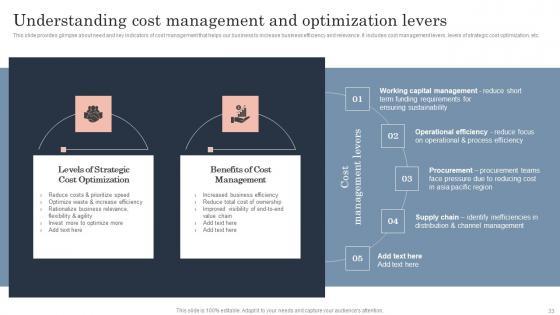 This slide provides glimpse about need and key indicators of cost management that helps our business to increase business efficiency and relevance. It includes cost management levers, levels of strategic cost optimization, etc.Do you have to make sure that everyone on your team knows about any specific topic I yes, then you should give Understanding Cost Management And Optimization Levers Guide To Corporate Financial Growth Plan Icons Pdf a try. Our experts have put a lot of knowledge and effort into creating this impeccable Understanding Cost Management And Optimization Levers Guide To Corporate Financial Growth Plan Icons Pdf. You can use this template for your upcoming presentations, as the slides are perfect to represent even the tiniest detail. You can download these templates from the Slidegeeks website and these are easy to edit. So grab these today. This slide provides glimpse about need and key indicators of cost management that helps our business to increase business efficiency and relevance. It includes cost management levers, levels of strategic cost optimization, etc.