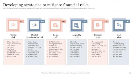 This slide provides glimpse about multiple strategies required to reduce and eliminate all financial risks. It includes risks such as liquidity risk, taxation risk, cost risk, etc.This Developing Strategies To Mitigate Financial Risks Guide To Corporate Financial Growth Plan Pdf is perfect for any presentation, be it in front of clients or colleagues. It is a versatile and stylish solution for organizing your meetings. The Developing Strategies To Mitigate Financial Risks Guide To Corporate Financial Growth Plan Pdf features a modern design for your presentation meetings. The adjustable and customizable slides provide unlimited possibilities for acing up your presentation. Slidegeeks has done all the homework before launching the product for you. So, do not wait, grab the presentation templates today This slide provides glimpse about multiple strategies required to reduce and eliminate all financial risks. It includes risks such as liquidity risk, taxation risk, cost risk, etc.