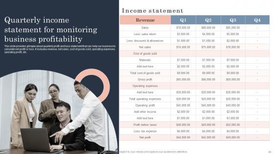 This slide provides glimpse about quarterly profit and loss statement that can help our business to calculate net profit or loss. It includes revenue, net sales, cost of goods sold, operating expenses, operating profit, etc.Are you searching for a Quarterly Income Statement For Monitoring Guide To Corporate Financial Growth Plan Elements Pdf that is uncluttered, straightforward, and original Its easy to edit, and you can change the colors to suit your personal or business branding. For a presentation that expresses how much effort you have put in, this template is ideal. With all of its features, including tables, diagrams, statistics, and lists, its perfect for a business plan presentation. Make your ideas more appealing with these professional slides. Download Quarterly Income Statement For Monitoring Guide To Corporate Financial Growth Plan Elements Pdf from Slidegeeks today. This slide provides glimpse about quarterly profit and loss statement that can help our business to calculate net profit or loss. It includes revenue, net sales, cost of goods sold, operating expenses, operating profit, etc.