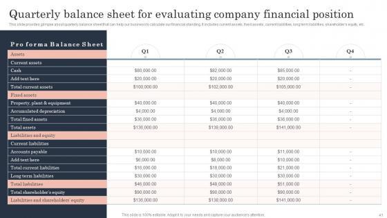 This slide provides glimpse about quarterly balance sheet that can help our business to calculate our financial standing. It includes current assets, fixed assets, current liabilities, long term liabilities, shareholders equity, etc.Take your projects to the next level with our ultimate collection of Quarterly Balance Sheet For Evaluating Company Guide To Corporate Financial Growth Plan Slides Pdf. Slidegeeks has designed a range of layouts that are perfect for representing task or activity duration, keeping track of all your deadlines at a glance. Tailor these designs to your exact needs and give them a truly corporate look with your own brand colors they all make your projects stand out from the rest. This slide provides glimpse about quarterly balance sheet that can help our business to calculate our financial standing. It includes current assets, fixed assets, current liabilities, long term liabilities, shareholders equity, etc.