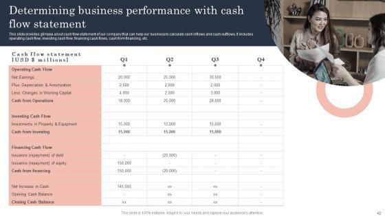 This slide provides glimpse about cash flow statement of our company that can help our business to calculate cash inflows and cash outflows. It includes operating cash flow, investing cash flow, financing cash flows, cash from financing, etc.This modern and well-arranged Determining Business Performance With Cash Guide To Corporate Financial Growth Plan Portrait Pdf provides lots of creative possibilities. It is very simple to customize and edit with the Powerpoint Software. Just drag and drop your pictures into the shapes. All facets of this template can be edited with Powerpoint no extra software is necessary. Add your own material, put your images in the places assigned for them, adjust the colors, and then you can show your slides to the world, with an animated slide included. This slide provides glimpse about cash flow statement of our company that can help our business to calculate cash inflows and cash outflows. It includes operating cash flow, investing cash flow, financing cash flows, cash from financing, etc.