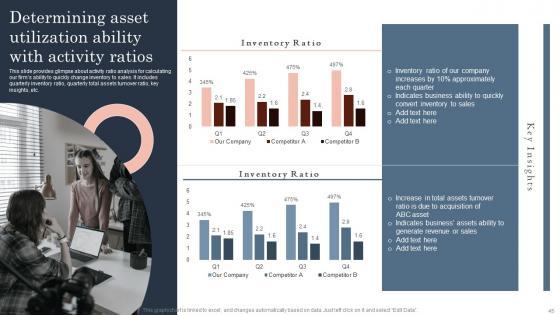 This slide provides glimpse about activity ratio analysis for calculating our firms ability to quickly change inventory to sales. It includes quarterly inventory ratio, quarterly total assets turnover ratio, key insights, etc.Coming up with a presentation necessitates that the majority of the effort goes into the content and the message you intend to convey. The visuals of a PowerPoint presentation can only be effective if it supplements and supports the story that is being told. Keeping this in mind our experts created Determining Asset Utilization Ability With Guide To Corporate Financial Growth Plan Mockup Pdf to reduce the time that goes into designing the presentation. This way, you can concentrate on the message while our designers take care of providing you with the right template for the situation. This slide provides glimpse about activity ratio analysis for calculating our firms ability to quickly change inventory to sales. It includes quarterly inventory ratio, quarterly total assets turnover ratio, key insights, etc.