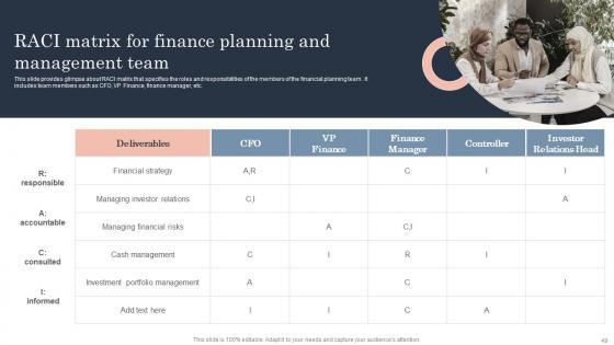 This slide provides glimpse about RACI matrix that specifies the roles and responsibilities of the members of the financial planning team . It includes team members such as CFO, VP Finance, finance manager, etc.Find a pre-designed and impeccable Raci Matrix For Finance Planning And Management Guide To Corporate Financial Growth Plan Rules Pdf. The templates can ace your presentation without additional effort. You can download these easy-to-edit presentation templates to make your presentation stand out from others. So, what are you waiting for Download the template from Slidegeeks today and give a unique touch to your presentation. This slide provides glimpse about RACI matrix that specifies the roles and responsibilities of the members of the financial planning team . It includes team members such as CFO, VP Finance, finance manager, etc.