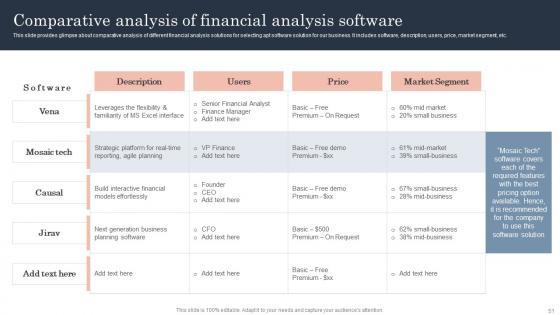This slide provides glimpse about comparative analysis of different financial analysis solutions for selecting apt software solution for our business. It includes software, description, users, price, market segment, etc.Are you in need of a template that can accommodate all of your creative concepts This one is crafted professionally and can be altered to fit any style. Use it with Google Slides or PowerPoint. Include striking photographs, symbols, depictions, and other visuals. Fill, move around, or remove text boxes as desired. Test out color palettes and font mixtures. Edit and save your work, or work with colleagues. Download Comparative Analysis Of Financial Analysis Guide To Corporate Financial Growth Plan Download Pdf and observe how to make your presentation outstanding. Give an impeccable presentation to your group and make your presentation unforgettable. This slide provides glimpse about comparative analysis of different financial analysis solutions for selecting apt software solution for our business. It includes software, description, users, price, market segment, etc.