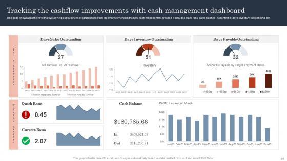 This slide showcases the KPIs that would help our business organization to track the improvements in the new cash management process. It includes quick ratio, cash balance, current ratio, days inventory outstanding, etc.Want to ace your presentation in front of a live audience Our Tracking The Cashflow Improvements With Cash Guide To Corporate Financial Growth Plan Pictures Pdf can help you do that by engaging all the users towards you.. Slidegeeks experts have put their efforts and expertise into creating these impeccable powerpoint presentations so that you can communicate your ideas clearly. Moreover, all the templates are customizable, and easy-to-edit and downloadable. Use these for both personal and commercial use. This slide showcases the KPIs that would help our business organization to track the improvements in the new cash management process. It includes quick ratio, cash balance, current ratio, days inventory outstanding, etc.