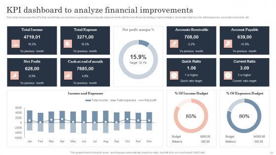 This slide showcases the KPIs that would help our business organization to evaluate improvements with the new financial strategy implementation. It includes total income, total expenses, accounts receivable, etc.Presenting this PowerPoint presentation, titled Kpi Dashboard To Analyze Financial Guide To Corporate Financial Growth Plan Designs Pdf, with topics curated by our researchers after extensive research. This editable presentation is available for immediate download and provides attractive features when used. Download now and captivate your audience. Presenting this Kpi Dashboard To Analyze Financial Guide To Corporate Financial Growth Plan Designs Pdf. Our researchers have carefully researched and created these slides with all aspects taken into consideration. This is a completely customizable Kpi Dashboard To Analyze Financial Guide To Corporate Financial Growth Plan Designs Pdf that is available for immediate downloading. Download now and make an impact on your audience. Highlight the attractive features available with our PPTs. This slide showcases the KPIs that would help our business organization to evaluate improvements with the new financial strategy implementation. It includes total income, total expenses, accounts receivable, etc.