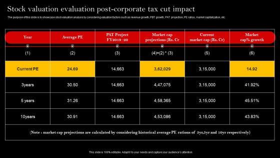 The purpose of this slide is to showcase stock valuation analysis by considering valuation factors such as revenue growth, PBT growth, PAT projection, PE ratios, market capitalization, etc. Showcasing this set of slides titled Stock Valuation Evaluation Post Corporate Tax Cut Impact Formats Pdf The topics addressed in these templates are Project, Market Cap Projections, Market All the content presented in this PPT design is completely editable. Download it and make adjustments in color, background, font etc. as per your unique business setting. The purpose of this slide is to showcase stock valuation analysis by considering valuation factors such as revenue growth, PBT growth, PAT projection, PE ratios, market capitalization, etc.
