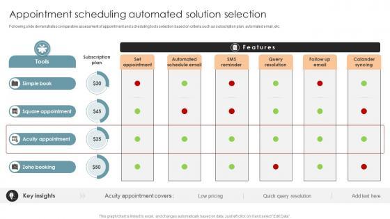 Following slide demonstrates comparative assessment of appointment and scheduling tools selection based on criteria such as subscription plan, automated email, etc.Create an editable Appointment Scheduling Automated Solution Selection Office Process Optimization To Increase Cost Efficiency that communicates your idea and engages your audience. Whether you are presenting a business or an educational presentation, pre-designed presentation templates help save time. Appointment Scheduling Automated Solution Selection Office Process Optimization To Increase Cost Efficiency is highly customizable and very easy to edit, covering many different styles from creative to business presentations. Slidegeeks has creative team members who have crafted amazing templates. So, go and get them without any delay. Following slide demonstrates comparative assessment of appointment and scheduling tools selection based on criteria such as subscription plan, automated email, etc.