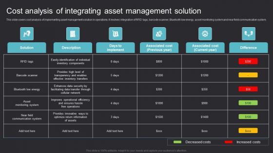 This slide covers cost analysis of implementing asset management solution in operations. It involves integration of RFID tags, barcode scanner, Bluetooth low energy, asset monitoring system and near field communication system. Whether you have daily or monthly meetings, a brilliant presentation is necessary. Cost Analysis Of Integrating Maximizing Efficiency With Asset Tracking Solutions Guidelines Pdf can be your best option for delivering a presentation. Represent everything in detail using Cost Analysis Of Integrating Maximizing Efficiency With Asset Tracking Solutions Guidelines Pdf and make yourself stand out in meetings. The template is versatile and follows a structure that will cater to your requirements. All the templates prepared by Slidegeeks are easy to download and edit. Our research experts have taken care of the corporate themes as well. So, give it a try and see the results. This slide covers cost analysis of implementing asset management solution in operations. It involves integration of RFID tags, barcode scanner, Bluetooth low energy, asset monitoring system and near field communication system.