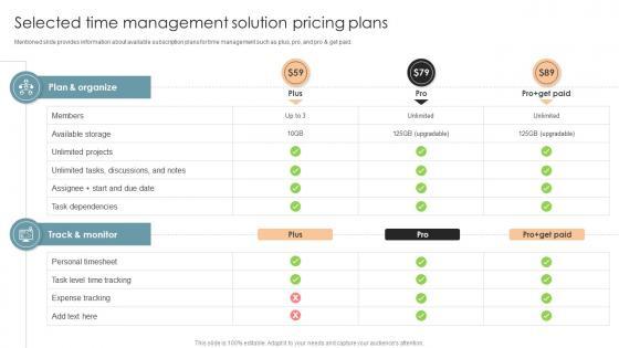 Mentioned slide provides information about available subscription plans for time management such as plus, pro, and pro and get paid.The Selected Time Management Solution Pricing Plans Office Process Optimization To Increase Cost Efficiency is a compilation of the most recent design trends as a series of slides. It is suitable for any subject or industry presentation, containing attractive visuals and photo spots for businesses to clearly express their messages. This template contains a variety of slides for the user to input data, such as structures to contrast two elements, bullet points, and slides for written information. Slidegeeks is prepared to create an impression. Mentioned slide provides information about available subscription plans for time management such as plus, pro, and pro and get paid.
