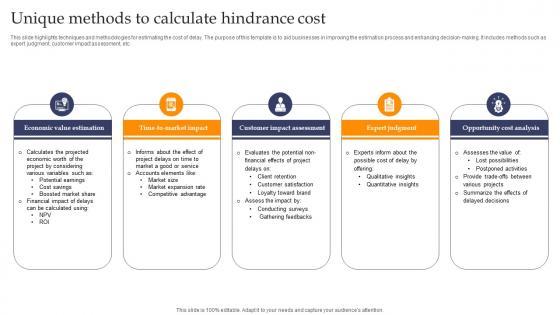 This slide highlights techniques and methodologies for estimating the cost of delay. The purpose of this template is to aid businesses in improving the estimation process and enhancing decision-making. It includes methods such as expert judgment, customer impact assessment, etc. Showcasing this set of slides titled Unique Methods To Calculate Hindrance Cost Background pdf. The topics addressed in these templates are Economic Value Estimation,Customer Impact Assessment,Expert Judgment. All the content presented in this PPT design is completely editable. Download it and make adjustments in color, background, font etc. as per your unique business setting. This slide highlights techniques and methodologies for estimating the cost of delay. The purpose of this template is to aid businesses in improving the estimation process and enhancing decision-making. It includes methods such as expert judgment, customer impact assessment, etc.