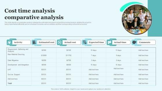 This slide depicts a comparative analysis between the estimated and actual cost and time involved analyze whether the project is being implemented efficiently and on schedule or It includes various activities and their corresponding cost and time involved. Persuade your audience using this Cost Time Analysis Comparative Analysis Professional PDF. This PPT design covers five stages, thus making it a great tool to use. It also caters to a variety of topics including Estimated Cost, Actual Cost, Development And Integration. Download this PPT design now to present a convincing pitch that not only emphasizes the topic but also showcases your presentation skills.
