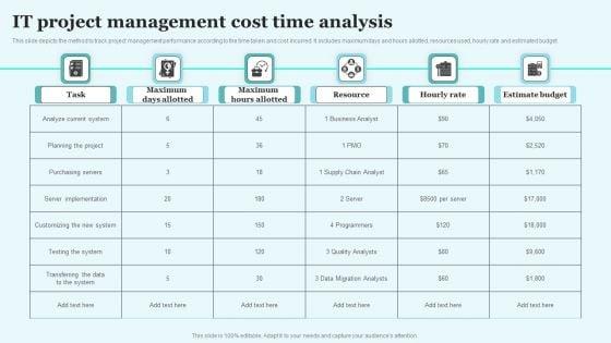This slide depicts the method to track project management performance according to the time taken and cost incurred. It includes maximum days and hours allotted, resources used, hourly rate and estimated budget. Showcasing this set of slides titled IT Project Management Cost Time Analysis Brochure PDF. The topics addressed in these templates are Purchasing Servers, Analyze Current System, Resource. All the content presented in this PPT design is completely editable. Download it and make adjustments in color, background, font etc. as per your unique business setting.
