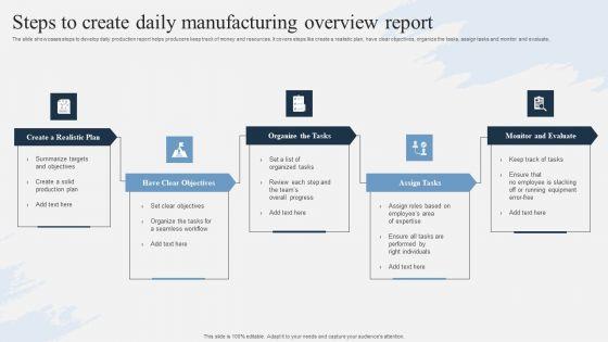 The slide showcases steps to develop daily production report helps producers keep track of money and resources. It covers steps like create a realistic plan, have clear objectives, organize the tasks, assign tasks and monitor and evaluate. Presenting Steps To Create Daily Manufacturing Overview Report Demonstration PDF to dispense important information. This template comprises five stages. It also presents valuable insights into the topics including Objectives, Assign Tasks, Evaluate. This is a completely customizable PowerPoint theme that can be put to use immediately. So, download it and address the topic impactfully.