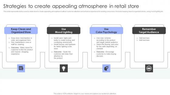This slide represents tactics used by retail store to create appealing atmosphere to attract customer attention and enhance experience for existing consumers. It include keeping clean and organized stores, using mood lighting etc. Slidegeeks has constructed Strategies To Create Appealing Atmosphere In Retail Store Inspiration PDF after conducting extensive research and examination. These presentation templates are constantly being generated and modified based on user preferences and critiques from editors. Here, you will find the most attractive templates for a range of purposes while taking into account ratings and remarks from users regarding the content. This is an excellent jumping off point to explore our content and will give new users an insight into our top notch PowerPoint Templates.