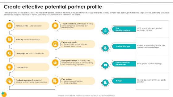 This slide presents an ideal partner persona that help identify potential partners in the market. It includes information about, partner profile, industry, company size, location, product services, target audience, partnership goals, ideal partnerships, pain points, key decision makers, partnership types, communication preferences and budget. Find a pre-designed and impeccable Create Effective Potential Partner Profile Partner Relationship Ppt Slides. The templates can ace your presentation without additional effort. You can download these easy-to-edit presentation templates to make your presentation stand out from others. So, what are you waiting for Download the template from Slidegeeks today and give a unique touch to your presentation. This slide presents an ideal partner persona that help identify potential partners in the market. It includes information about, partner profile, industry, company size, location, product services, target audience, partnership goals, ideal partnerships, pain points, key decision makers, partnership types, communication preferences and budget.