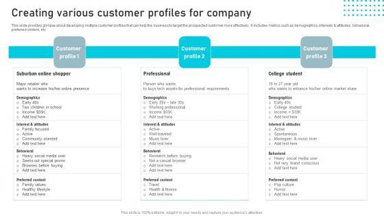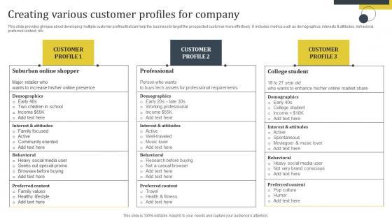 This slide provides glimpse about developing multiple customer profiles that can help the business to target the prospected customer more effectively. It includes metrics such as demographics, interests and attitudes, behavioral, preferred content, etc. Boost your pitch with our creative Planning Sales Campaign To Improve Creating Various Customer Profiles For Company Slides PDF. Deliver an awe-inspiring pitch that will mesmerize everyone. Using these presentation templates you will surely catch everyones attention. You can browse the ppts collection on our website. We have researchers who are experts at creating the right content for the templates. So you dont have to invest time in any additional work. Just grab the template now and use them.