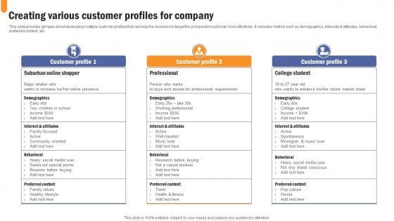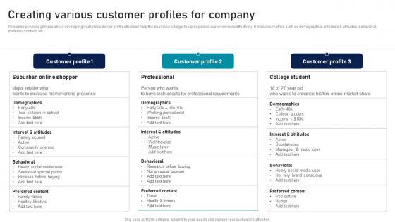 This slide provides glimpse about developing multiple customer profiles that can help the business to target the prospected customer more effectively. It includes metrics such as demographics, interests and attitudes, behavioral, preferred content, etc. Find highly impressive Enhance Customer Retention Creating Various Customer Profiles For Company Introduction Pdf on Slidegeeks to deliver a meaningful presentation. You can save an ample amount of time using these presentation templates. No need to worry to prepare everything from scratch because Slidegeeks experts have already done a huge research and work for you. You need to download Enhance Customer Retention Creating Various Customer Profiles For Company Introduction Pdf for your upcoming presentation. All the presentation templates are 100 percent editable and you can change the color and personalize the content accordingly. Download now. This slide provides glimpse about developing multiple customer profiles that can help the business to target the prospected customer more effectively. It includes metrics such as demographics, interests and attitudes, behavioral, preferred content, etc.