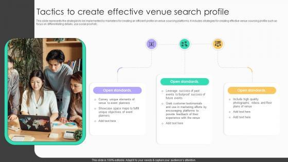 This slide represents the strategies to be implemented by marketers for creating an efficient profile on venue sourcing platforms. It includes strategies for creating effective venue sourcing profile such as focus on differentiating details, use social proof etc. Do you know about Slidesgeeks Online Venue Advertising Plan Tactics To Create Effective Venue Search Profile Strategy SS V These are perfect for delivering any kind od presentation. Using it, create PowerPoint presentations that communicate your ideas and engage audiences. Save time and effort by using our pre-designed presentation templates that are perfect for a wide range of topic. Our vast selection of designs covers a range of styles, from creative to business, and are all highly customizable and easy to edit. Download as a PowerPoint template or use them as Google Slides themes. This slide represents the strategies to be implemented by marketers for creating an efficient profile on venue sourcing platforms. It includes strategies for creating effective venue sourcing profile such as focus on differentiating details, use social proof etc.