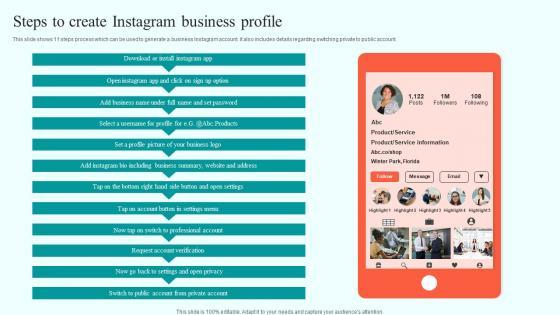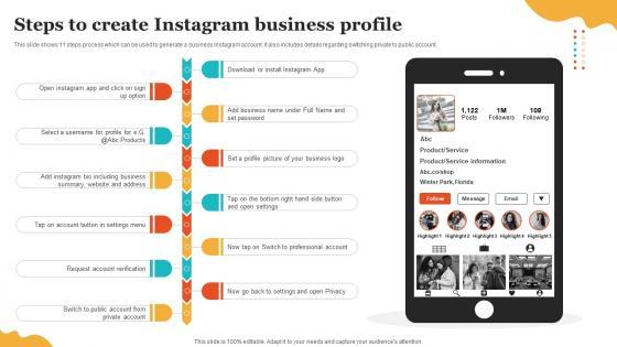 This slide shows 11 steps process which can be used to generate a business Instagram account. it also includes details regarding switching private to public account. Here you can discover an assortment of the finest PowerPoint and Google Slides templates. With these templates, you can create presentations for a variety of purposes while simultaneously providing your audience with an eye-catching visual experience. Download Social Media Marketing To Enhance Steps To Create Instagram Business Profile MKT SS V to deliver an impeccable presentation. These templates will make your job of preparing presentations much quicker, yet still, maintain a high level of quality. Slidegeeks has experienced researchers who prepare these templates and write high-quality content for you. Later on, you can personalize the content by editing the Social Media Marketing To Enhance Steps To Create Instagram Business Profile MKT SS V. This slide shows 11 steps process which can be used to generate a business Instagram account. it also includes details regarding switching private to public account.