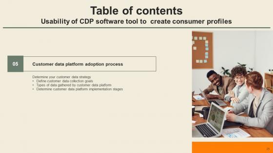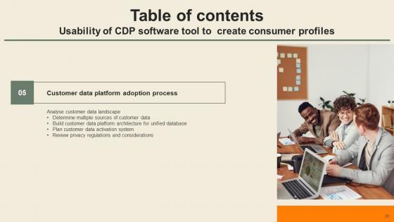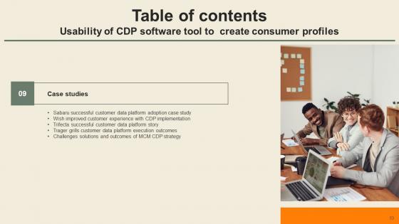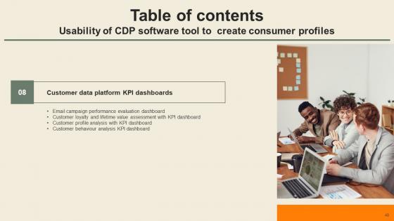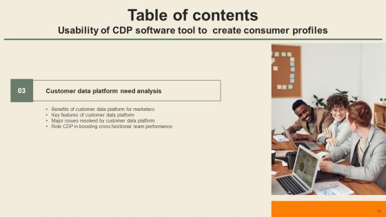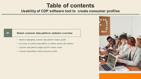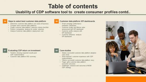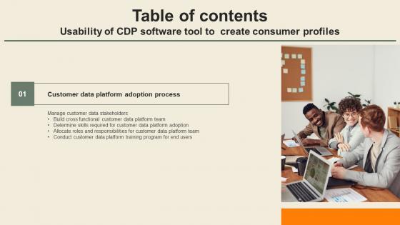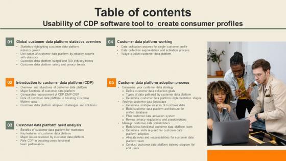 From laying roadmaps to briefing everything in detail, our templates are perfect for you. You can set the stage with your presentation slides. All you have to do is download these easy-to-edit and customizable templates. Usability Of CDP Software Tool To Create Consumer Profiles Table Of Contents Template Pdf will help you deliver an outstanding performance that everyone would remember and praise you for. Do download this presentation today. Our Usability Of CDP Software Tool To Create Consumer Profiles Table Of Contents Template Pdf are topically designed to provide an attractive backdrop to any subject. Use them to look like a presentation pro.