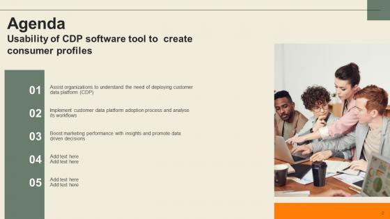 Find a pre-designed and impeccable Agenda Usability Of CDP Software Tool To Create Consumer Profiles Template Pdf. The templates can ace your presentation without additional effort. You can download these easy-to-edit presentation templates to make your presentation stand out from others. So, what are you waiting for Download the template from Slidegeeks today and give a unique touch to your presentation. Our Agenda Usability Of CDP Software Tool To Create Consumer Profiles Template Pdf are topically designed to provide an attractive backdrop to any subject. Use them to look like a presentation pro.