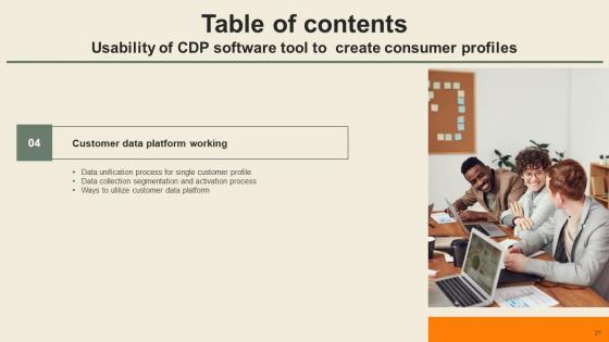 Slidegeeks is one of the best resources for PowerPoint templates. You can download easily and regulate Table Of Contents Usability Of CDP Software Tool To Create Consumer Profiles Download Pdf for your personal presentations from our wonderful collection. A few clicks is all it takes to discover and get the most relevant and appropriate templates. Use our Templates to add a unique zing and appeal to your presentation and meetings. All the slides are easy to edit and you can use them even for advertisement purposes. Our Table Of Contents Usability Of CDP Software Tool To Create Consumer Profiles Download Pdf are topically designed to provide an attractive backdrop to any subject. Use them to look like a presentation pro.