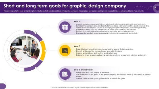 This slide highlights the short-term and long-term milestones which includes establishing the building a strong membership base and retaining existing members, establishing a positive reputation in the community. Do you know about Slidesgeeks Creative Agency Business Plan Short And Long Term Goals For Graphic Design Company BP SS V These are perfect for delivering any kind od presentation. Using it, create PowerPoint presentations that communicate your ideas and engage audiences. Save time and effort by using our pre-designed presentation templates that are perfect for a wide range of topic. Our vast selection of designs covers a range of styles, from creative to business, and are all highly customizable and easy to edit. Download as a PowerPoint template or use them as Google Slides themes. This slide highlights the short-term and long-term milestones which includes establishing the building a strong membership base and retaining existing members, establishing a positive reputation in the community.