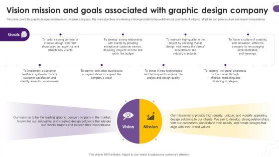 This slide covers the graphic design company vision, mission, and goals. The main objectives is to develop a stronger relationships with the local community. It will also reflect the companys culture and reason for operations. Want to ace your presentation in front of a live audience Our Creative Agency Business Plan Vision Mission And Goals Associated With Graphic Design BP SS V can help you do that by engaging all the users towards you. Slidegeeks experts have put their efforts and expertise into creating these impeccable powerpoint presentations so that you can communicate your ideas clearly. Moreover, all the templates are customizable, and easy-to-edit and downloadable. Use these for both personal and commercial use. This slide covers the graphic design company vision, mission, and goals. The main objectives is to develop a stronger relationships with the local community. It will also reflect the companys culture and reason for operations.