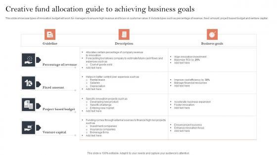 This slide showcase types of innovation budget will work for managers to ensure high revenue and focus on customer value. It include types such as percentage of revenue, fixed amount, project based budget and venture capital. Showcasing this set of slides titled Creative Fund Allocation Guide To Achieving Business Goals Structure Pdf. The topics addressed in these templates are Venture Capital, Project Based Budget, Revenue. All the content presented in this PPT design is completely editable. Download it and make adjustments in color, background, font etc. as per your unique business setting. This slide showcase types of innovation budget will work for managers to ensure high revenue and focus on customer value. It include types such as percentage of revenue, fixed amount, project based budget and venture capital.