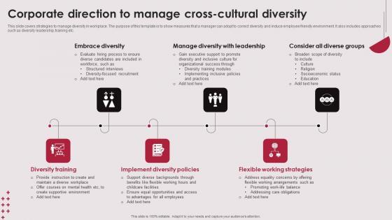 This slide covers strategies to manage diversity in workplace. The purpose of this template is to show measures that a manager can adopt to correct diversity and induce employee friendly environment. It also includes approaches such as diversity leadership, training etc. Pitch your topic with ease and precision using this Corporate Direction To Manage Cross Cultural Diversity Rules PDF. This layout presents information on Diversity Training, Implement Diversity Policies, Flexible Working Strategies. It is also available for immediate download and adjustment. So, changes can be made in the color, design, graphics or any other component to create a unique layout. This slide covers strategies to manage diversity in workplace. The purpose of this template is to show measures that a manager can adopt to correct diversity and induce employee friendly environment. It also includes approaches such as diversity leadership, training etc.