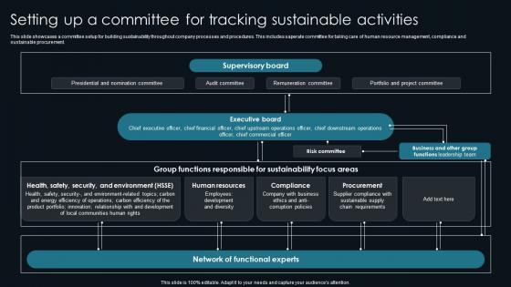 This slide showcases a committee setup for building sustainability throughout company processes and procedures. This includes saperate committee for taking care of human resource management, compliance and sustainable procurement. Crafting an eye-catching presentation has never been more straightforward. Let your presentation shine with this tasteful yet straightforward Setting Up A Committee For Tracking Customer Centric Advertising Pictures PDF template. It offers a minimalistic and classy look that is great for making a statement. The colors have been employed intelligently to add a bit of playfulness while still remaining professional. Construct the ideal Setting Up A Committee For Tracking Customer Centric Advertising Pictures PDF that effortlessly grabs the attention of your audience Begin now and be certain to wow your customers This slide showcases a committee setup for building sustainability throughout company processes and procedures. This includes saperate committee for taking care of human resource management, compliance and sustainable procurement.
