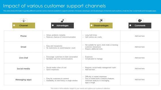 This slide shows information regarding different customer service channels available to support customers. It includes advantages and disadvantages of channels such as phone, email, live chat, social media and messaging apps. From laying roadmaps to briefing everything in detail, our templates are perfect for you. You can set the stage with your presentation slides. All you have to do is download these easy-to-edit and customizable templates. Client Support Plan To Increase Customer Impact Of Various Customer Support Channels Strategy SS V will help you deliver an outstanding performance that everyone would remember and praise you for. Do download this presentation today. This slide shows information regarding different customer service channels available to support customers. It includes advantages and disadvantages of channels such as phone, email, live chat, social media and messaging apps.