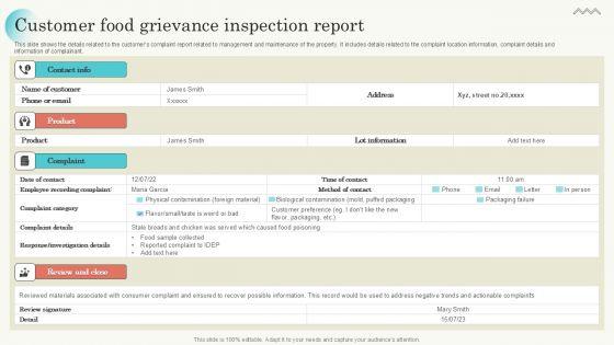 This slide shows the details related to the customers complaint report related to management and maintenance of the property. It includes details related to the complaint location information, complaint details and information of complainant. Showcasing this set of slides titled Customer Food Grievance Inspection Report Portrait PDF. The topics addressed in these templates are Contact Info, Complaint, Product, Review And Close. All the content presented in this PPT design is completely editable. Download it and make adjustments in color, background, font etc. as per your unique business setting.