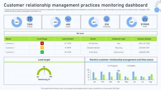 Following slide demonstrates KPI dashboard to track business relationship management practices which can be adopted by companies to increase sales. It includes key points such as contacts, deals, campaigns, CRM activities progress status, lead targets, lead details, etc. Find a pre-designed and impeccable A83 Relationship Management Automation Software Customer Relationship Management. The templates can ace your presentation without additional effort. You can download these easy-to-edit presentation templates to make your presentation stand out from others. So, what are you waiting for Download the template from Slidegeeks today and give a unique touch to your presentation. Following slide demonstrates KPI dashboard to track business relationship management practices which can be adopted by companies to increase sales. It includes key points such as contacts, deals, campaigns, CRM activities progress status, lead targets, lead details, etc.