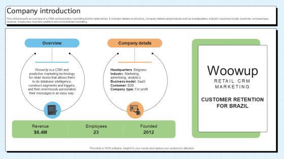 This slid presents an overview of a CRM and predictive marketing tool for retail stores. It includes details on about us, company details and products such as headquarters, industry, business model, customer, company type, revenue, employees, founded, platform and omnichannel marketing. Slidegeeks is one of the best resources for PowerPoint templates. You can download easily and regulate Company Introduction Customer Relationship Management Platform Pitch Deck for your personal presentations from our wonderful collection. A few clicks is all it takes to discover and get the most relevant and appropriate templates. Use our Templates to add a unique zing and appeal to your presentation and meetings. All the slides are easy to edit and you can use them even for advertisement purposes. This slid presents an overview of a CRM and predictive marketing tool for retail stores. It includes details on about us, company details and products such as headquarters, industry, business model, customer, company type, revenue, employees, founded, platform and omnichannel marketing.