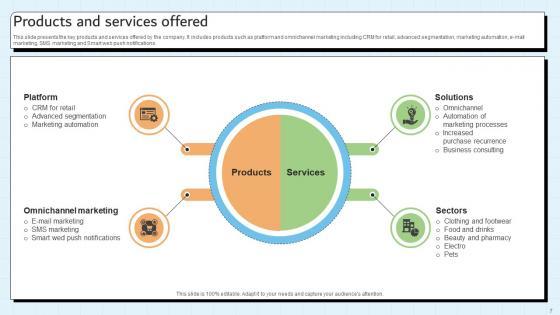 This slide presents the key products and services offered by the company. It includes products such as platform and omnichannel marketing including CRM for retail, advanced segmentation, marketing automation, e-mail marketing, SMS marketing and Smart web push notifications. Coming up with a presentation necessitates that the majority of the effort goes into the content and the message you intend to convey. The visuals of a PowerPoint presentation can only be effective if it supplements and supports the story that is being told. Keeping this in mind our experts created Products And Services Offered Customer Relationship Management Platform Pitch Deck to reduce the time that goes into designing the presentation. This way, you can concentrate on the message while our designers take care of providing you with the right template for the situation. This slide presents the key products and services offered by the company. It includes products such as platform and omnichannel marketing including CRM for retail, advanced segmentation, marketing automation, e-mail marketing, SMS marketing and Smart web push notifications.