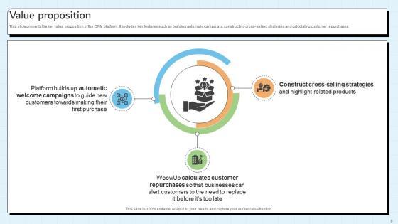 This slide presents the key value proposition of the CRM platform. It includes key features such as building automatic campaigns, constructing cross selling strategies and calculating customer repurchases. Explore a selection of the finest Value Proposition Customer Relationship Management Platform Pitch Deck here. With a plethora of professionally designed and pre-made slide templates, you can quickly and easily find the right one for your upcoming presentation. You can use our Value Proposition Customer Relationship Management Platform Pitch Deck to effectively convey your message to a wider audience. Slidegeeks has done a lot of research before preparing these presentation templates. The content can be personalized and the slides are highly editable. Grab templates today from Slidegeeks. This slide presents the key value proposition of the CRM platform. It includes key features such as building automatic campaigns, constructing cross selling strategies and calculating customer repurchases.