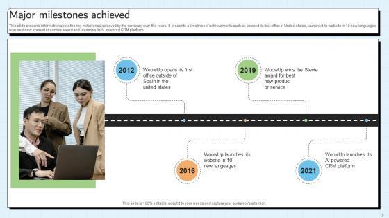 This slide presents information about the key milestones achieved by the company over the years. It presents a timelines of achievements such as opened its first office in United states, launched its website in 10 new languages, won best new product or service award and launches its AI-powered CRM platform. If you are looking for a format to display your unique thoughts, then the professionally designed Major Milestones Achieved Customer Relationship Management Platform Pitch Deck is the one for you. You can use it as a Google Slides template or a PowerPoint template. Incorporate impressive visuals, symbols, images, and other charts. Modify or reorganize the text boxes as you desire. Experiment with shade schemes and font pairings. Alter, share or cooperate with other people on your work. Download Major Milestones Achieved Customer Relationship Management Platform Pitch Deck and find out how to give a successful presentation. Present a perfect display to your team and make your presentation unforgettable. This slide presents information about the key milestones achieved by the company over the years. It presents a timelines of achievements such as opened its first office in United states, launched its website in 10 new languages, won best new product or service award and launches its AI-powered CRM platform.