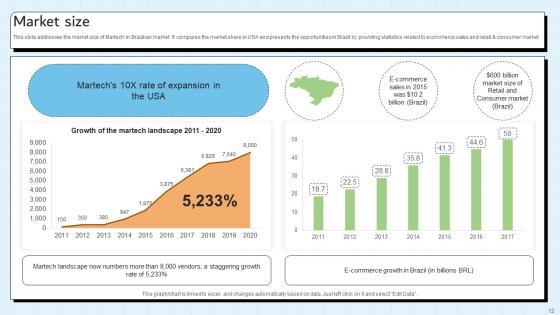 This slide addresses the market size of Martech in Brazilian market. It compares the market share in USA and presents the opportunities in Brazil by providing statistics related to ecommerce sales and retail and consumer market. Are you in need of a template that can accommodate all of your creative concepts This one is crafted professionally and can be altered to fit any style. Use it with Google Slides or PowerPoint. Include striking photographs, symbols, depictions, and other visuals. Fill, move around, or remove text boxes as desired. Test out color palettes and font mixtures. Edit and save your work, or work with colleagues. Download Market Size Customer Relationship Management Platform Pitch Deck and observe how to make your presentation outstanding. Give an impeccable presentation to your group and make your presentation unforgettable. This slide addresses the market size of Martech in Brazilian market. It compares the market share in USA and presents the opportunities in Brazil by providing statistics related to ecommerce sales and retail and consumer market.