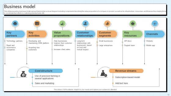 This slide presents a business model canvas that provides a visual diagram including components describing the value proposition of a company or product, as well as its infrastructure, consumers, and finances thus helping firms to coordinate their efforts by outlining potential trade-offs. Boost your pitch with our creative Business Model Customer Relationship Management Platform Pitch Deck. Deliver an awe-inspiring pitch that will mesmerize everyone. Using these presentation templates you will surely catch everyones attention. You can browse the ppts collection on our website. We have researchers who are experts at creating the right content for the templates. So you do not have to invest time in any additional work. Just grab the template now and use them. This slide presents a business model canvas that provides a visual diagram including components describing the value proposition of a company or product, as well as its infrastructure, consumers, and finances thus helping firms to coordinate their efforts by outlining potential trade-offs.