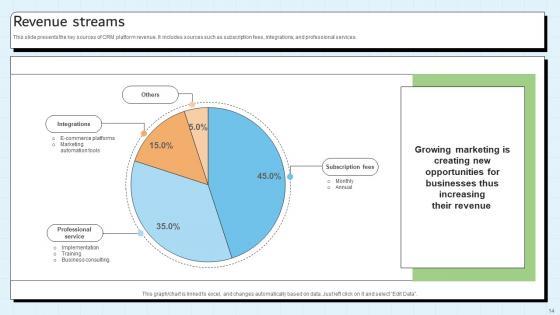 This slide presents the key sources of CRM platform revenue. It includes sources such as subscription fees, integrations, and professional services. This modern and well-arranged Revenue Streams Customer Relationship Management Platform Pitch Deck provides lots of creative possibilities. It is very simple to customize and edit with the Powerpoint Software. Just drag and drop your pictures into the shapes. All facets of this template can be edited with Powerpoint, no extra software is necessary. Add your own material, put your images in the places assigned for them, adjust the colors, and then you can show your slides to the world, with an animated slide included. This slide presents the key sources of CRM platform revenue. It includes sources such as subscription fees, integrations, and professional services.