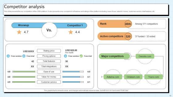 This slide presents the key competitors of the CRM platform. It also presents a key comparison of features and ratings of the platform including, ease of use, value for money, customer service, total features, etc. Want to ace your presentation in front of a live audience Our Competitor Analysis Customer Relationship Management Platform Pitch Deck can help you do that by engaging all the users towards you. Slidegeeks experts have put their efforts and expertise into creating these impeccable powerpoint presentations so that you can communicate your ideas clearly. Moreover, all the templates are customizable, and easy-to-edit and downloadable. Use these for both personal and commercial use. This slide presents the key competitors of the CRM platform. It also presents a key comparison of features and ratings of the platform including, ease of use, value for money, customer service, total features, etc.