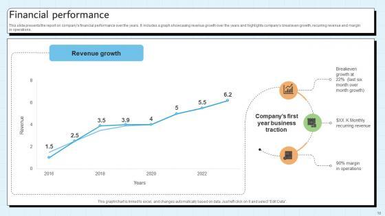 This slide presents the report on companys financial performance over the years. It includes a graph showcasing revenue growth over the years and highlights companys breakeven growth, recurring revenue and margin in operations. Present like a pro with Financial Performance Customer Relationship Management Platform Pitch Deck. Create beautiful presentations together with your team, using our easy-to-use presentation slides. Share your ideas in real-time and make changes on the fly by downloading our templates. So whether you are in the office, on the go, or in a remote location, you can stay in sync with your team and present your ideas with confidence. With Slidegeeks presentation got a whole lot easier. Grab these presentations today. This slide presents the report on companys financial performance over the years. It includes a graph showcasing revenue growth over the years and highlights companys breakeven growth, recurring revenue and margin in operations.
