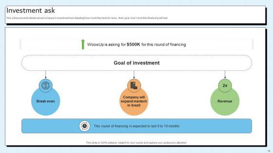 This slide presents details about companys investment ask detailing how much they tend to raise , their goal, how much this financing will last. Find highly impressive Investment Ask Customer Relationship Management Platform Pitch Deck on Slidegeeks to deliver a meaningful presentation. You can save an ample amount of time using these presentation templates. No need to worry to prepare everything from scratch because Slidegeeks experts have already done a huge research and work for you. You need to download Investment Ask Customer Relationship Management Platform Pitch Deck for your upcoming presentation. All the presentation templates are 100 percent editable and you can change the color and personalize the content accordingly. Download now This slide presents details about companys investment ask detailing how much they tend to raise , their goal, how much this financing will last.