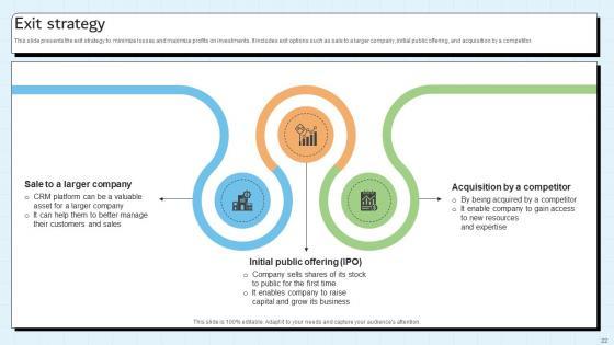 This slide presents the exit strategy to minimize losses and maximize profits on investments. It includes exit options such as sale to a larger company, initial public offering, and acquisition by a competitor. From laying roadmaps to briefing everything in detail, our templates are perfect for you. You can set the stage with your presentation slides. All you have to do is download these easy-to-edit and customizable templates. Exit Strategy Customer Relationship Management Platform Pitch Deck will help you deliver an outstanding performance that everyone would remember and praise you for. Do download this presentation today. This slide presents the exit strategy to minimize losses and maximize profits on investments. It includes exit options such as sale to a larger company, initial public offering, and acquisition by a competitor.