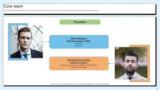 This slide presents information about core executive team members of the company. It includes details about the founders and their experience. Do you have to make sure that everyone on your team knows about any specific topic I yes, then you should give Core Team Customer Relationship Management Platform Pitch Deck a try. Our experts have put a lot of knowledge and effort into creating this impeccable Core Team Customer Relationship Management Platform Pitch Deck. You can use this template for your upcoming presentations, as the slides are perfect to represent even the tiniest detail. You can download these templates from the Slidegeeks website and these are easy to edit. So grab these today This slide presents information about core executive team members of the company. It includes details about the founders and their experience.