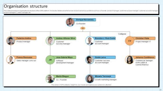 This slide presents an organizational structure of the CRM platform. It includes details about its human resource at various positions such as co-founder, product manager, customer success manager, customer account manager, project manager IT, sales manager, etc. Crafting an eye-catching presentation has never been more straightforward. Let your presentation shine with this tasteful yet straightforward Organisation Structure Customer Relationship Management Platform Pitch Deck template. It offers a minimalistic and classy look that is great for making a statement. The colors have been employed intelligently to add a bit of playfulness while still remaining professional. Construct the ideal Organisation Structure Customer Relationship Management Platform Pitch Deck that effortlessly grabs the attention of your audience Begin now and be certain to wow your customers This slide presents an organizational structure of the CRM platform. It includes details about its human resource at various positions such as co-founder, product manager, customer success manager, customer account manager, project manager IT, sales manager, etc.