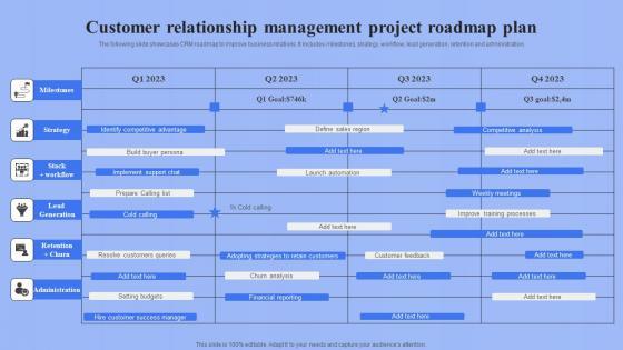 The following slide showcases CRM roadmap to improve business relations. It includes milestones, strategy, workflow, lead generation, retention and administration. Pitch your topic with ease and precision using this Customer Relationship Management Project Roadmap Plan Ppt Icon Show pdf. This layout presents information on Strategy, Workflow, Lead Generation. It is also available for immediate download and adjustment. So, changes can be made in the color, design, graphics or any other component to create a unique layout. The following slide showcases CRM roadmap to improve business relations. It includes milestones, strategy, workflow, lead generation, retention and administration.